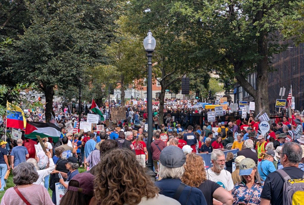 The event’s central slogan was “Workers Over Billionaires” and began with speeches from union organizers and political leaders to the crowd gathered on Boston Common, highlighting the power of working people and the urgent need for continued organizing. Thousands stood together, with each union represented with its own assembly. Present were teachers, healthcare workers, postal workers, municipal employees, gig workers, actors, transport workers, and tradespeople. Ally organizations like Massachusetts Peace Action, MassCare, and ACLU brought their contingents, as well. Boston DSA was represented by over fifty members wearing red shirts marching in solidarity with signs that read “Socialism Beats Fascism.”