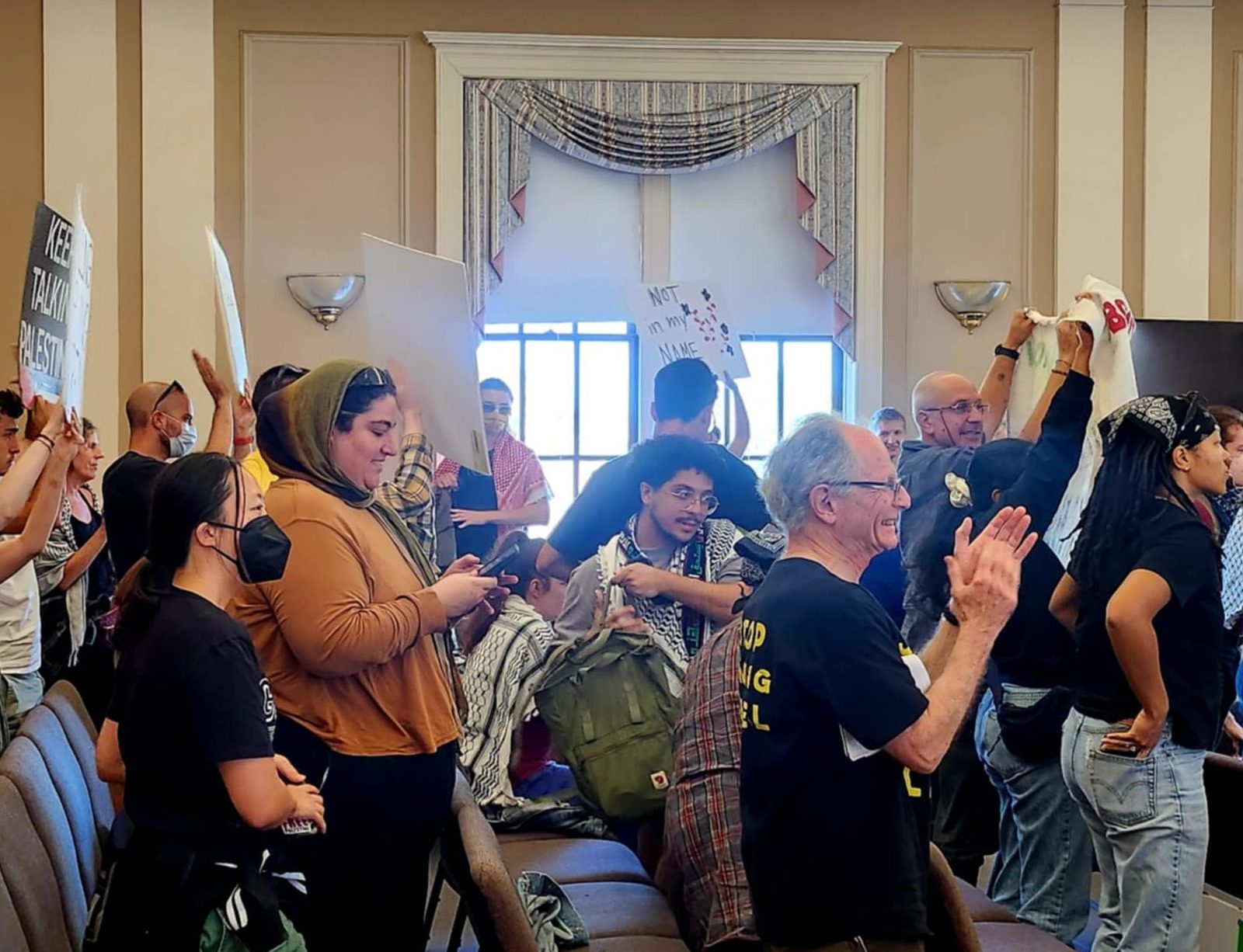 Even though 8000 signatures were certified by Elections prior to the hearing, Zionists still poured money into their challenge to decertify the “polarizing, divisive” ballot question to divest from genocide. Supporters rallied outside City Hall at 9:15AM before packing the council chamber for the hearing at 10AM.